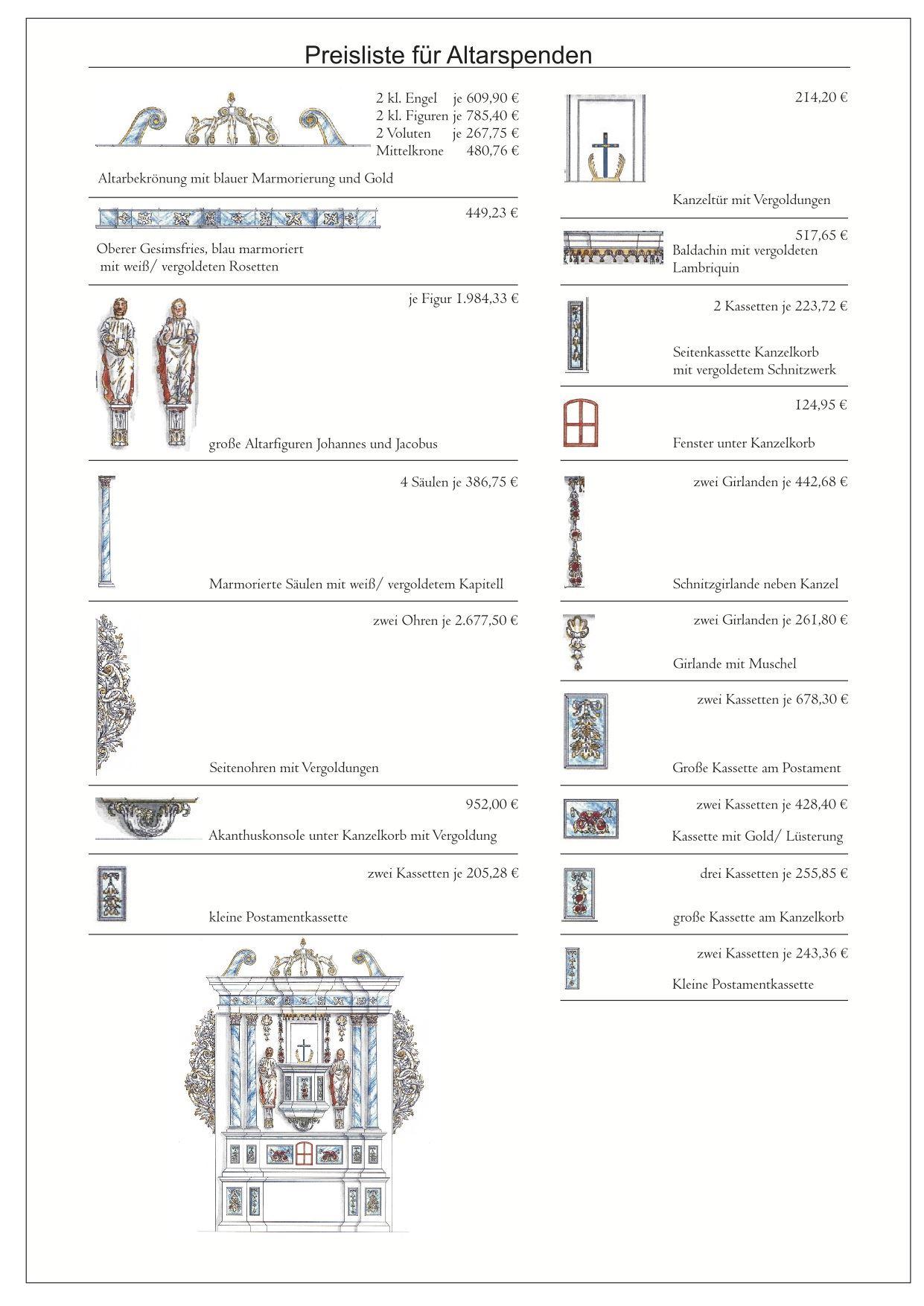 Um den Spendern einen konkreten Anreiz zu bieten, preiste der Restaurator, Herr Benno Busch, die 60 Einzelornamente des Altars aus. Die Möglichkeit, sich "sein Altarornament" zu kaufen, beflügelte viele Geberhände, andere wiederum spendeten objektfrei. In großer Dankbarkeit konnte deshalb zu Pfingsten 2014 das letzte Ornament (der zweite Posaunenengel) in respektabler Höhe platziert werden.